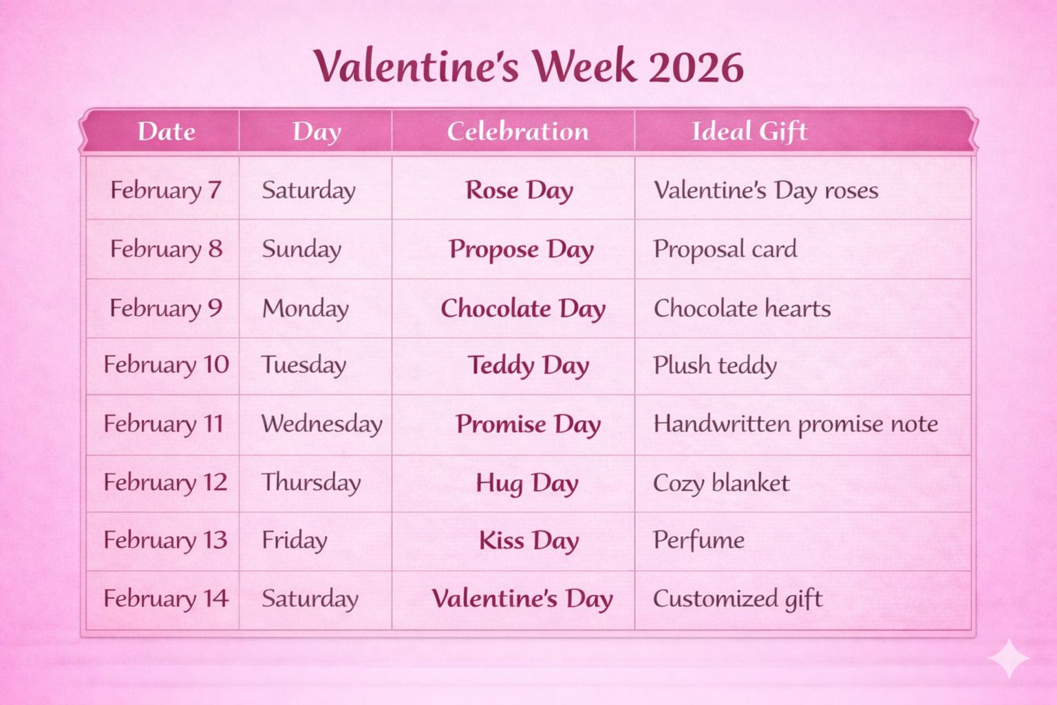 A romantic schedule for Valentine's Week outlining daily celebrations from Rose Day to Valentine's Day alongside perfect gift suggestions.Rose Day - February 7